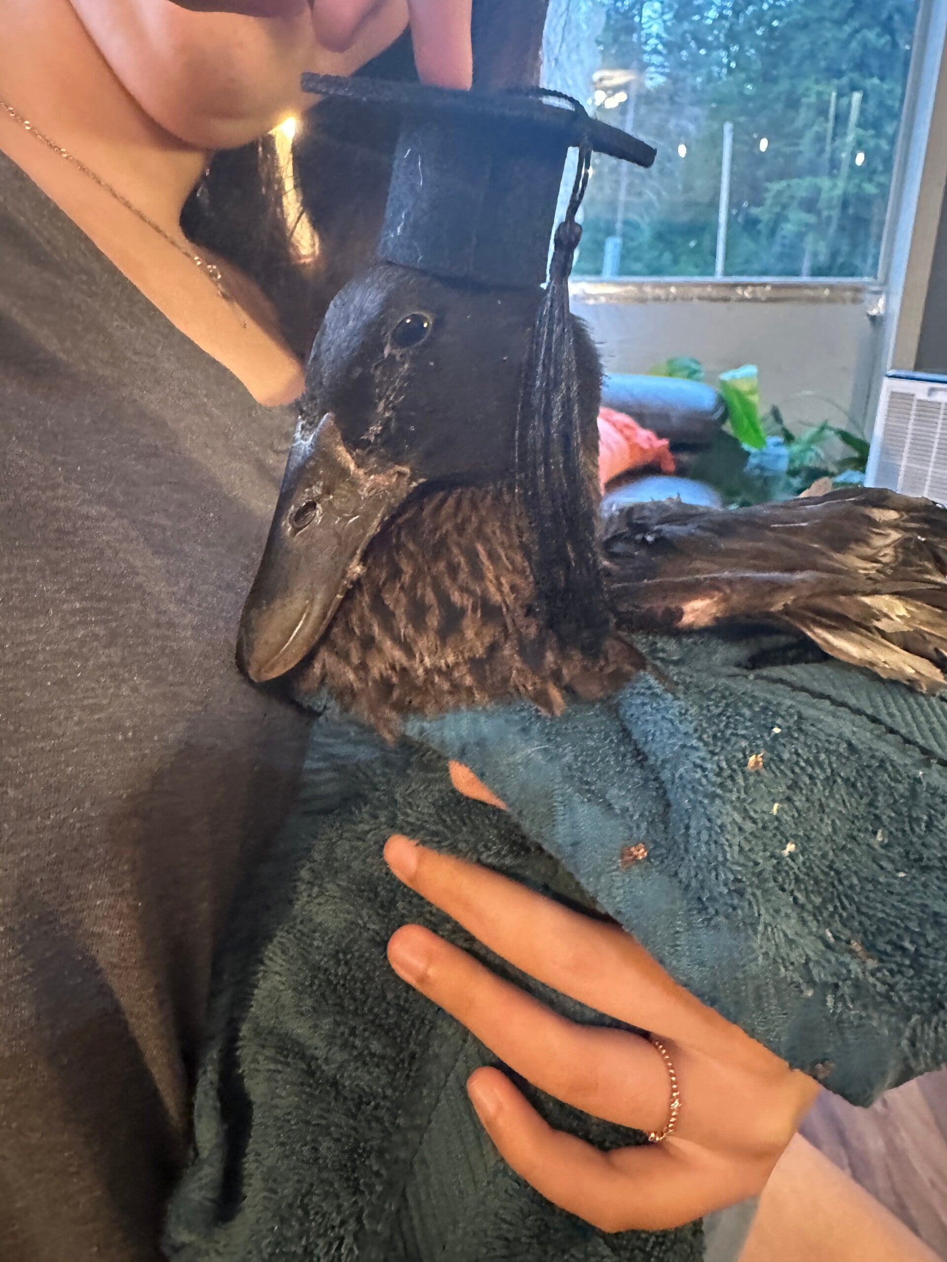 She now lives solo, with us in the house because she can not walk, living her best life, eating, snuggling and swimming.